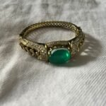 ​Seed Pearl Borders: Delicate white pearls are meticulously set against the golden brass to frame the central stones.