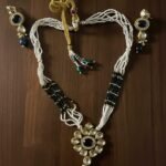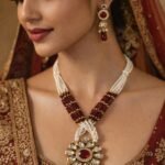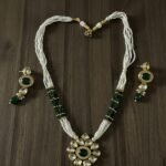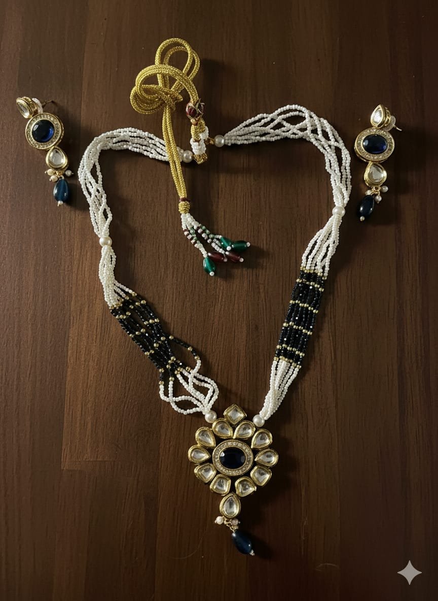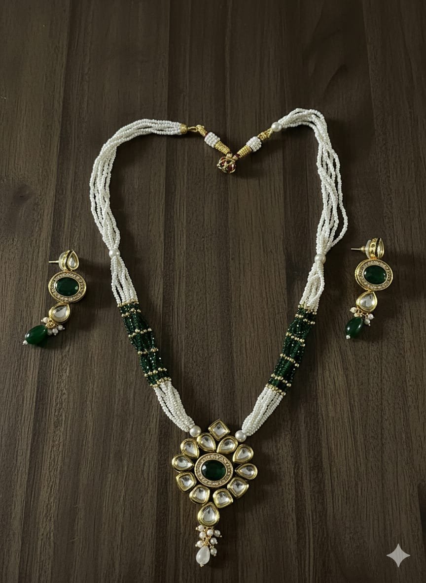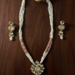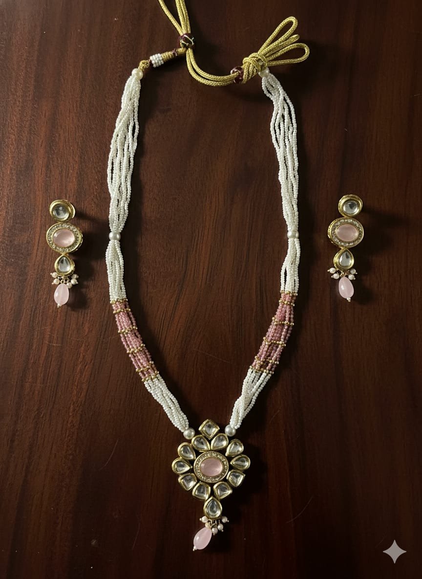 ​Earrings: A matching pair of Kundan drop earrings that mirror the pendant’s floral motif and soft pink palette.